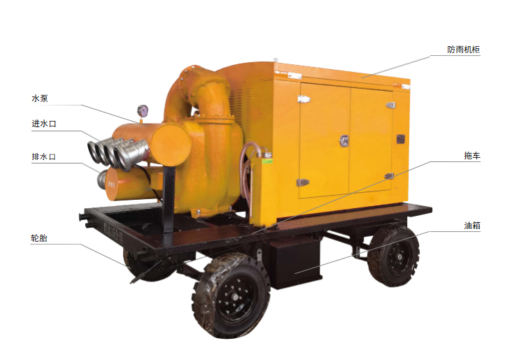 该型泵主要由拖车、柴油机、联轴器、自吸泵、叶轮、后盖、机械密封、泵轴、轴承座、进口阀、 气液分离管、加水阀门、进、排接管、防雨罩、真空辅助泵等组成,泵的结构参见上图。