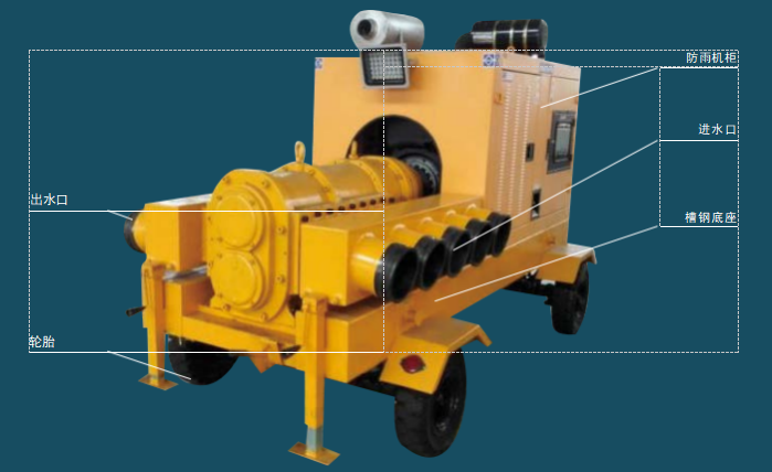 泵的工作原理:采用中开离心泵作抽水作业,具有吸程高、宽扬程、宽流量、自动调整扬程与流 量的特性, 在额定的功率范围内可以自动适应作业环境和作业要求, 实现远距离吸水、长距离输 水、大流量排水,同时可以用同一台装备分别用作排水、供水、消防的不同作业。