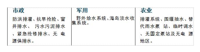 泵的工作原理:采用中开离心泵作抽水作业,具有吸程高、宽扬程、宽流量、自动调整扬程与流 量的特性, 在额定的功率范围内可以自动适应作业环境和作业要求, 实现远距离吸水、长距离输 水、大流量排水,同时可以用同一台装备分别用作排水、供水、消防的不同作业。