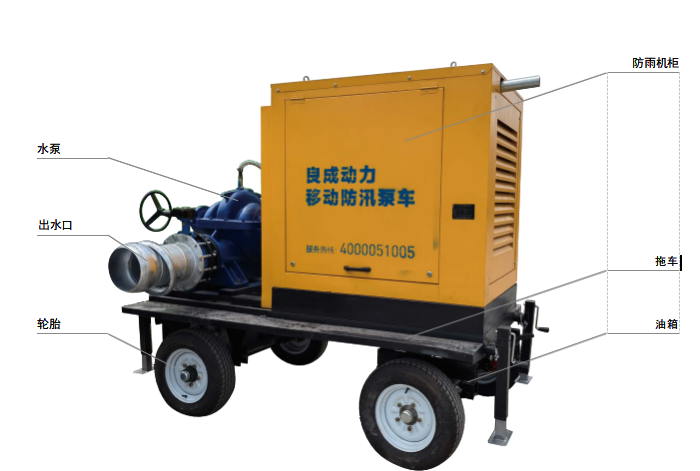 该型泵主要由拖车、柴油机、联轴器、自吸泵、叶轮、后盖、机械密封、泵轴、轴承座、进口阀、 气液分离管、加水阀门、进、排接管、防雨罩、真空辅助泵等组成,泵的结构参见上图。