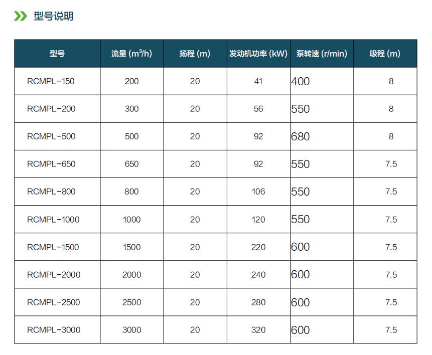 RCMPL 系列拖车式柴油机凸轮泵是在反复研究国内外同类技术的基础上开发成功的一种结构新颖的产品。该泵是 一种正排量自吸式旋转活塞泵,其工作原理如下:当动力带动传动轴传递扭矩时,主动轴驱动齿轮箱内的一对同步 齿轮及固定在泵轴上的二个转子做相对运动,使泵吸入端产生真空,排出端形成负载压力,来达到输送液体介质的 目的。泵连续转动时,在转子的相对作用下,泵轴每转动一转便由六次满载的液体介质排出。动力机的转向决定了 泵输送介质的方向,无正反转之分,在规定的转速范围内泵的流量大小与泵的转速成正比。可广泛适用于市政排污 及防涝工程、农业灌溉等。该泵组具有结构简单、自吸性能好、排污能力强、高效节能、使用维修方便。配用多功 能移动拖车。