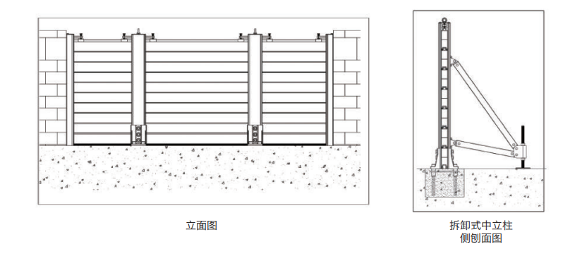 适用范围:主要用于铁路隧道口、大型港口码头、公路隧道口、高速公路涵洞口、人防洞口、城市河道区域等处等洪 水水位较高处或城市重要设施周边。 优 点 :是由于立柱、档板的支撑作用,能够防一定高度的洪水。 适用范围:立柱间距不大于2500mm,在河堤、坝顶、重要设备周边等区域应提前做好立柱基础及设置专用的预埋螺 栓套管等,同时应有位置设置立柱后挡板。