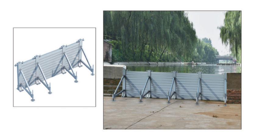 防洪挡水板一种专门用于城市防洪的新型装备,特别适用于硬质堤坝的加高,防止漫堤以及城市街道地下通道口、建筑 物等处防洪。 该产品采用单元模块设计,密闭性好,可形成多元化的隔断区域而快速排涝,且操作简单,安装迅速,拆装方便,能 重复使用,便于运输、储存。由于单元挡水墙跨度大,紧急情况下拆下挡水板可作为车辆通道。