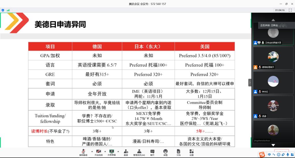 首先,钟永红同学主要从申请时的个人背景、准备流程以及共性问题解答等方面进行分享。让与会同学对海外申请有了初步认识。接着,王炜业同学为大家分享了申博时间线、美德日申请异同并对常见问题解答。最后,孟涵同学主要从出国动机、留学准备、东京大学IME项目的申请流程以及留学资助情况等方面为大家进行分享。