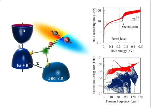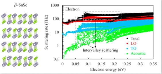 团队开发了全第一性求解电子-声子耦合输运于相互作用的计算软件,能够从载流子层面对热、电耦合输运散射机理进行理论预测,深入研究宽带隙半导体、热电材料、压电及热释电材料的能量转换机理,为性能优化调控提供理论基础。例如,团队通过对高温相硒化亚锡的电子及声子散射作了系统性的研究,阐明了电子的谷间散射在n型硒化亚锡中电学输运的重要性,提出了利用纳米工程将硒化亚锡晶粒限缩在10纳米左右,能够有效的提高提热电优值。团队进一步研究了压电半导体中,由于电偶矩导致的长程电声耦合作用对热导率的影响。团队提出了关于压电及弗勒里希耦合引起的声子散射率的解析公式。我们发现在六方氧化锌中,由于晶体中心对称性缺失的声子占多数,因此电声耦合对其热输运的影响较大。相关论文发表于Materials Today Physics。