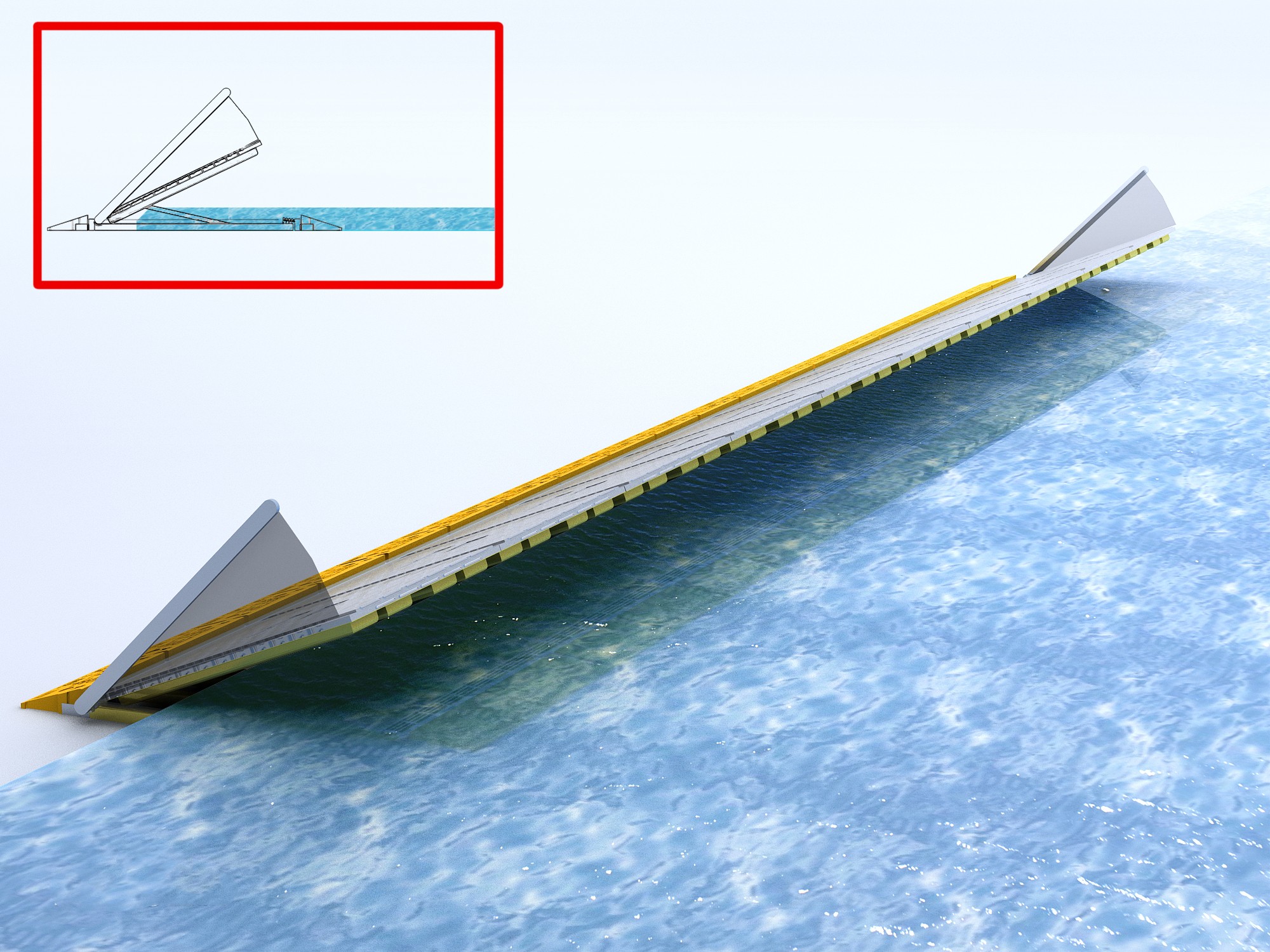 水动力防洪闸安装于地下建筑出入口,相邻模块柔性拼接,两侧柔性橡胶板将防洪闸与墙体有效密封连接。无水时,如同车辆限速带,车辆行人可无障碍通行。遇水倒灌时,水流从地面底框前端进水口流入挡水门扇下部,浮力推动挡水门扇前端向上翻转,防洪闸自动升起,从而实现全时段全自动挡水,无需电力驱动、无需人员值守,非常安全可靠管用。